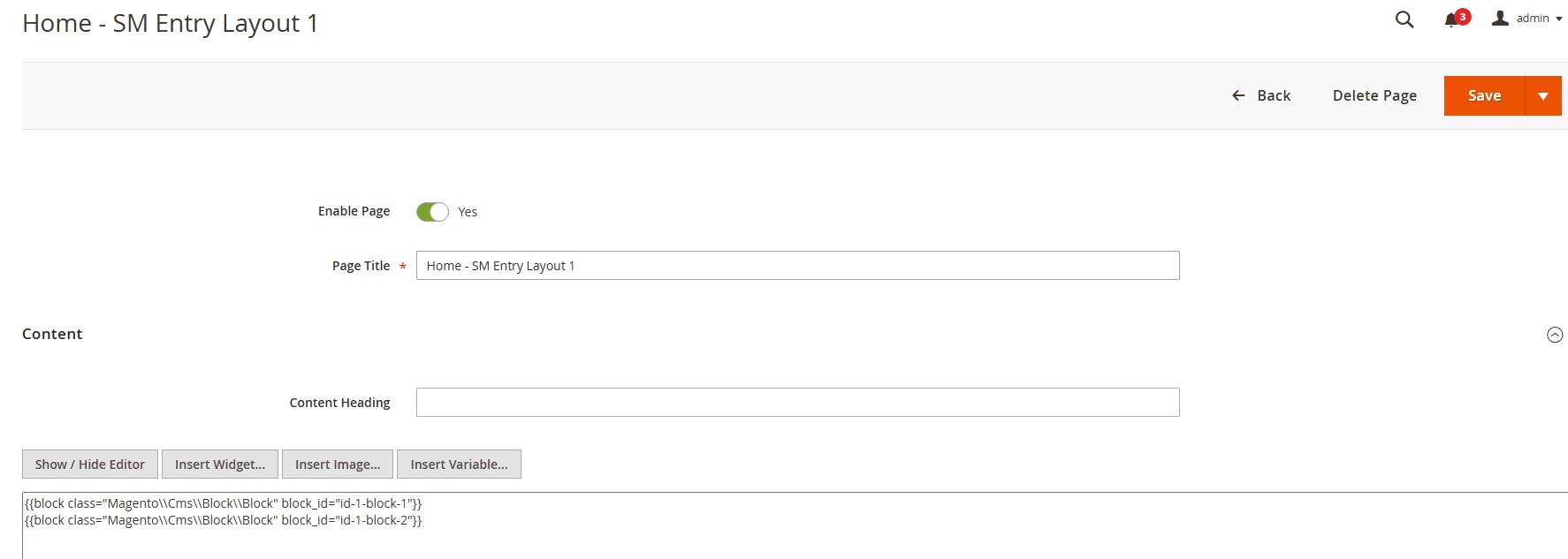 - Step 7: Navigate to Stores>> Settings>> Configuration >> MAGENTECH >> Sm Entry >> Theme Installation. Press the buttons named 'Static Blocks' and 'Pages' to import all default blocks and pages. Click "Save Configuarion" button to save your changes.