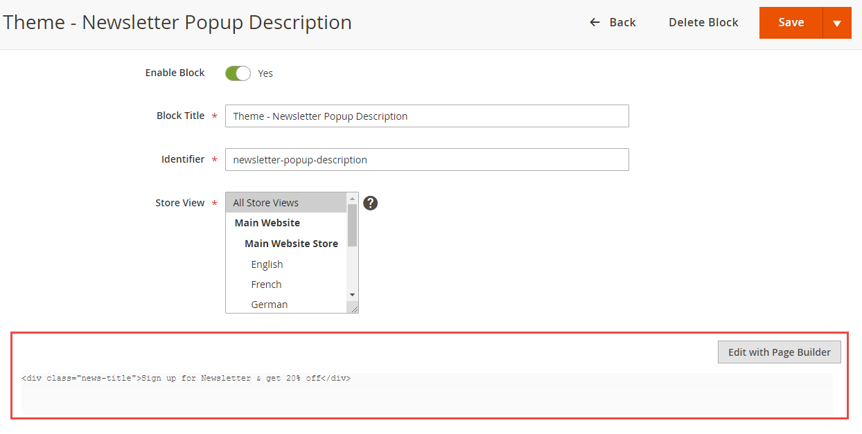To edit description, please go to Admin Panel > Content > Elements > Blocks > Search Identifier "newsletter-popup-description". "newsletter-popup-image"