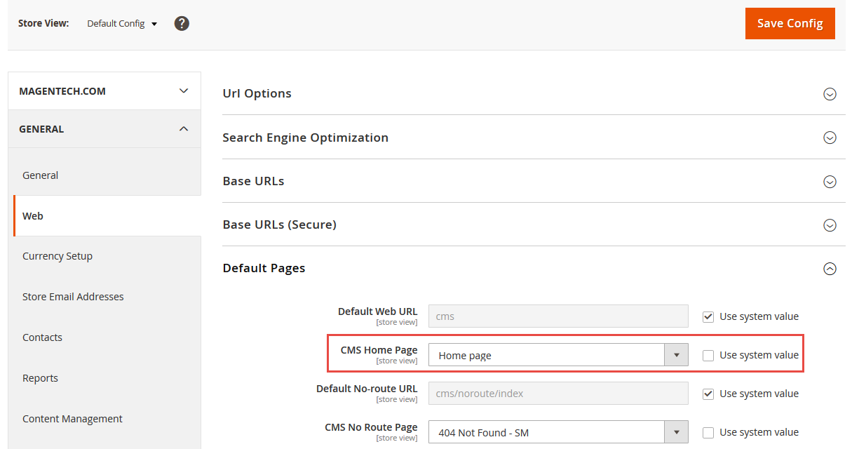 - To configure the default home page for your store, please go to Stores>> Settings >>Configuration>>General>>Web>>Default Pages tab, select the desired page in the CMS Home Page field and save configuration.